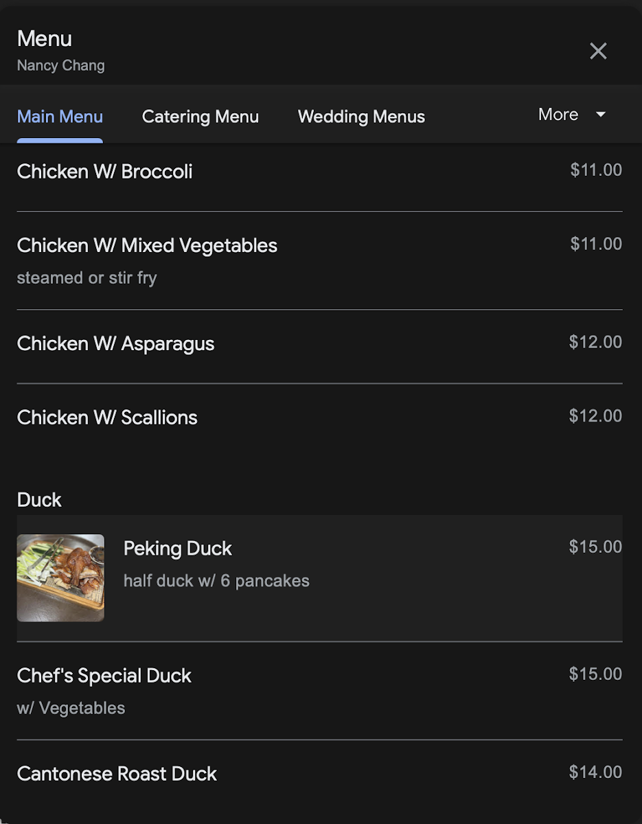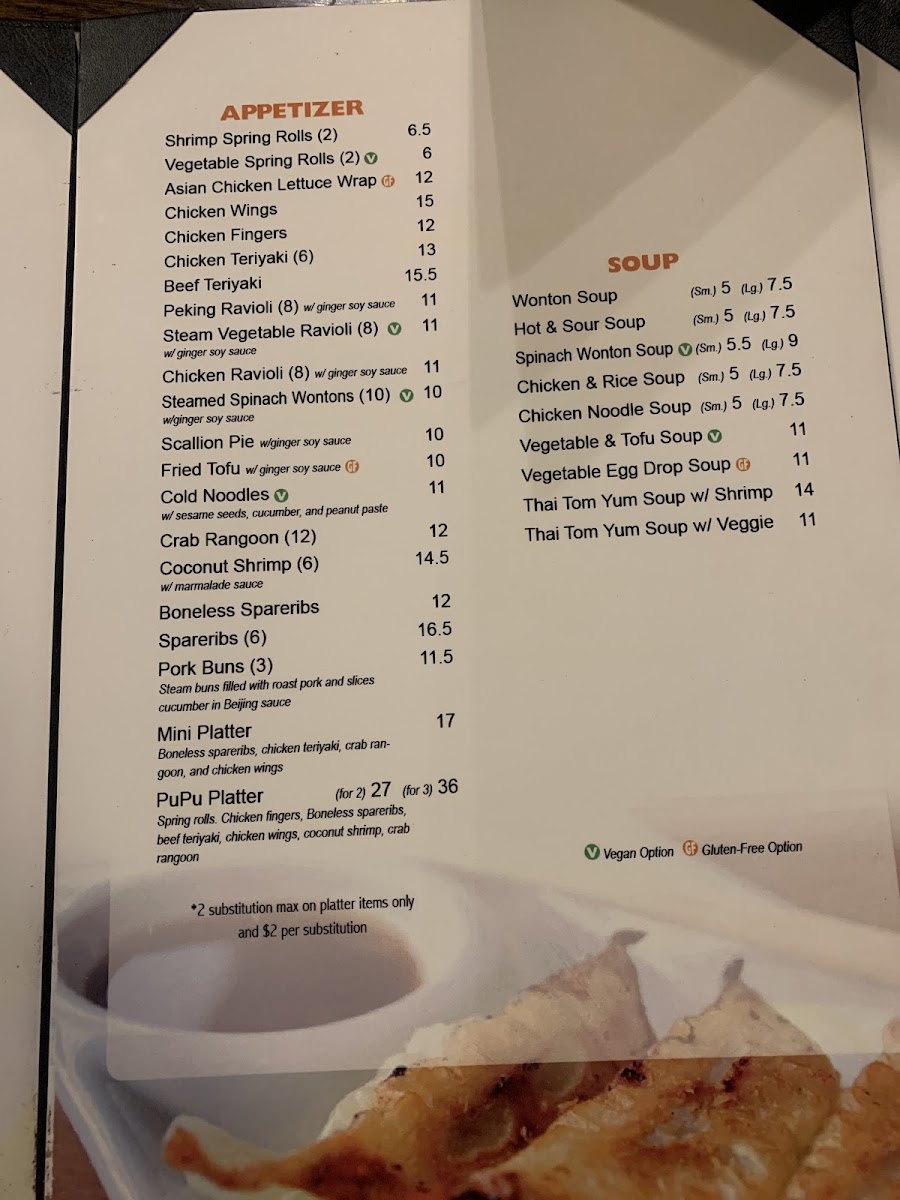 Boneless spareribs, chicken teriyaki, crab rangoon, and chicken wings